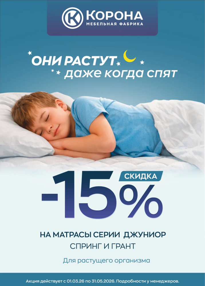 Забота о здоровом сне детей — наш приоритет. Специально для вас мы запускаем акцию на детские матрасы серии «Джуниор»! Только до 31 мая 2026 года на модели «Спринг» и «Гранд» действует скидка 15%.