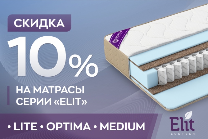 Скидка 10%  на матрасы «Elit» Lite, Optima, Medium  Акция действует с 01.07.2025г. до 30.11.2025г.